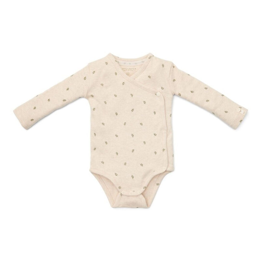 Body envolvente que hace muy fácil vestir a tu pequeño, material muy suave, color melange con estampado de pequeñas hojas por toda la prenda, algodón orgánico, certificado Oeko Tex. 100% algodón orgánico