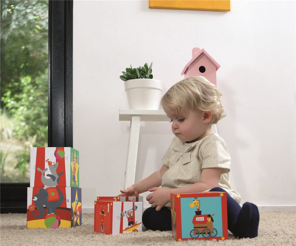 Una torre de construcción de vivos colores con 5 cubos de diferentes tamaños. Los cubos se pueden apilar uno encima del otro, pero también colocarse uno al lado del otro como un rompecabezas. Intenta completar el puzle oculto juntando los cuadrados con los lados correctos. Cinco de los seis lados tienen figuras y números de circo en ellos. Divertido, pero también educativo. Apilar, acertar, contar, reconocer animales y figuras, y mucho más. Hecho de cartón resistente y duradero.