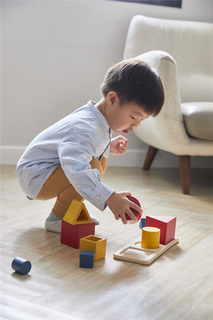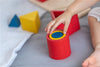 Usando tres tipos de bloques geométricos huecos (cubo, cilindro y triángulo), se invita a los niños a explorar la visión espacial, las habilidades matemáticas tempranas y la coordinación mano-ojo.