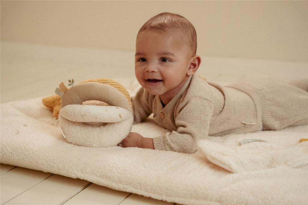 La pelota Montessori es un juguete de actividad ideal para de 0 a 6 meses. Las diferentes texturas invitan a los pequeños a sentir y agarrar.