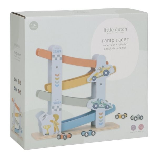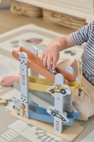 1, 2, 3 y ¡empieza! Con esta alegre rampa de carreras de madera que incluye 4 coches, tu pequeño se lo pasará en grande. Coloca los autos uno por uno en la parte superior de la pista de carreras, déjalos ir y correrán hacia abajo. ¡A los niños les encanta!